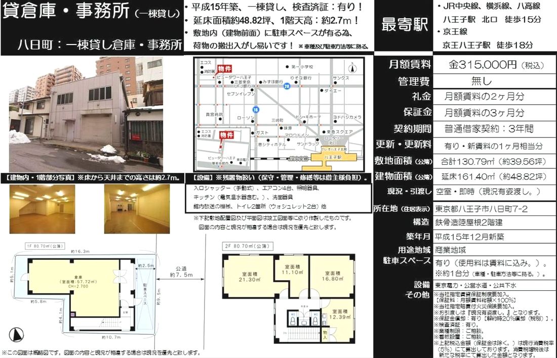 八王子市八日町7-2 八王子駅 貸倉庫事務所 一棟貸 詳細データ