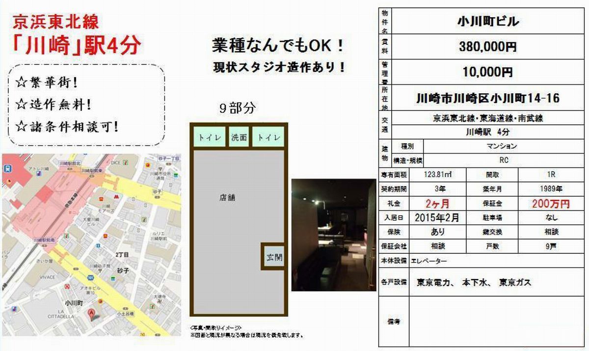 トップページ > 物件検索 > 川崎市の賃貸事務所・貸店舗 > 川崎の賃貸事務所・貸店舗 > 川崎市川崎区小川町14-16 小川町ビル