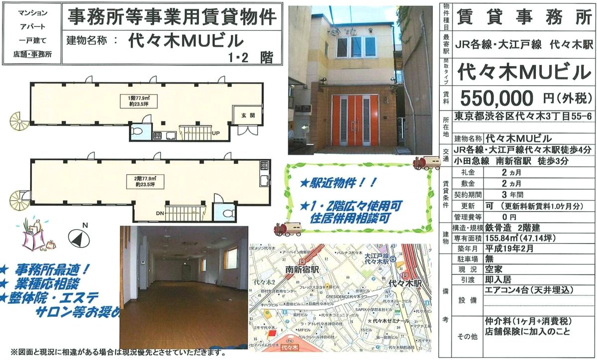 トップページ > 物件検索 > 渋谷区の賃貸事務所・貸店舗 > 代々木の賃貸事務所・貸店舗 > 渋谷区代々木3-55-6 代々木MUビル 1-2F部分