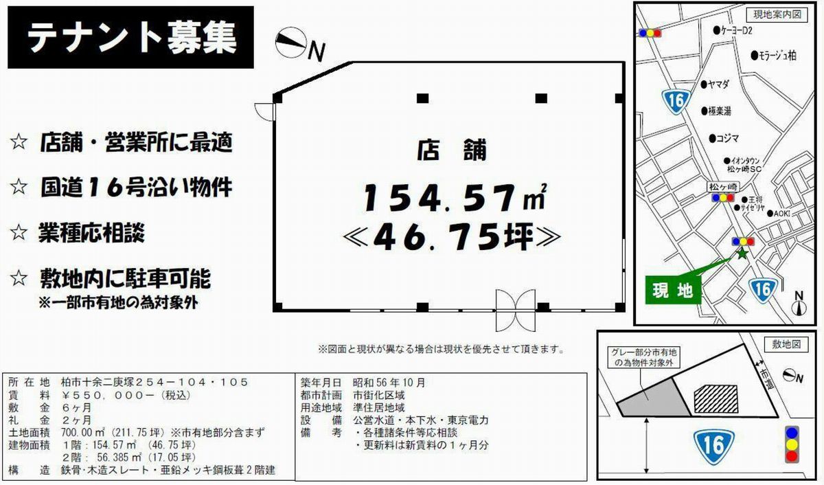 | 備考 | ロードサイド型 前面駐車場付 駐車スペース有 |