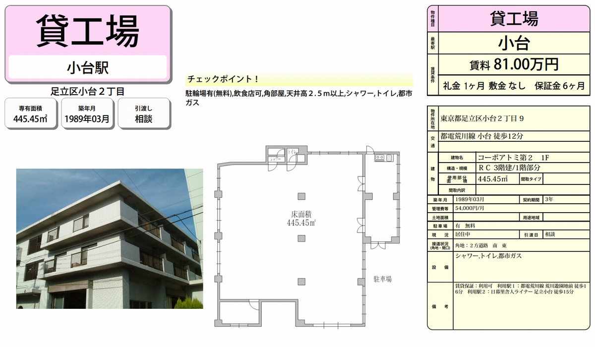 トップページ > 物件検索 > 足立区の賃貸事務所・貸店舗 > 足立区小台2-9 コーポアトミ第2