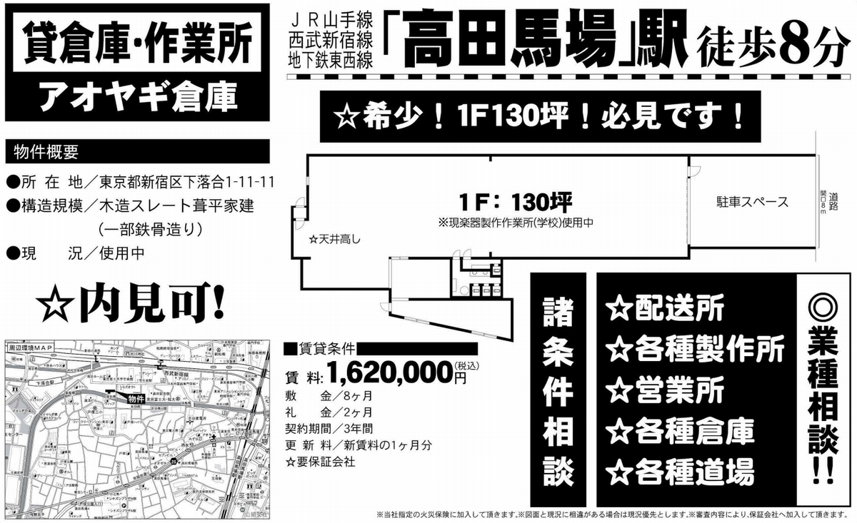 トップページ > 物件検索 > 新宿区の賃貸事務所・貸店舗 > 高田馬場の賃貸事務所・貸店舗 > 新宿区下落合1-11-11 アオヤギ倉庫