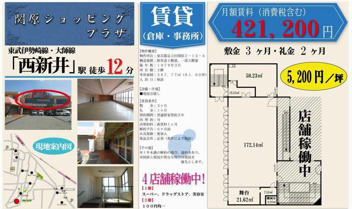 トップページ > 物件検索 > 足立区の賃貸事務所・貸店舗 > 西新井の賃貸事務所・貸店舗 > 足立区関原2-15-4 関原ショッピングプラザ