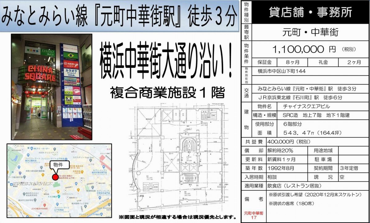 トップページ > 物件検索 > 横浜市の賃貸事務所・貸店舗 > 元町・中華街の賃貸事務所・貸店舗 > 横浜市中区山下町144 チャイナスクエアビル