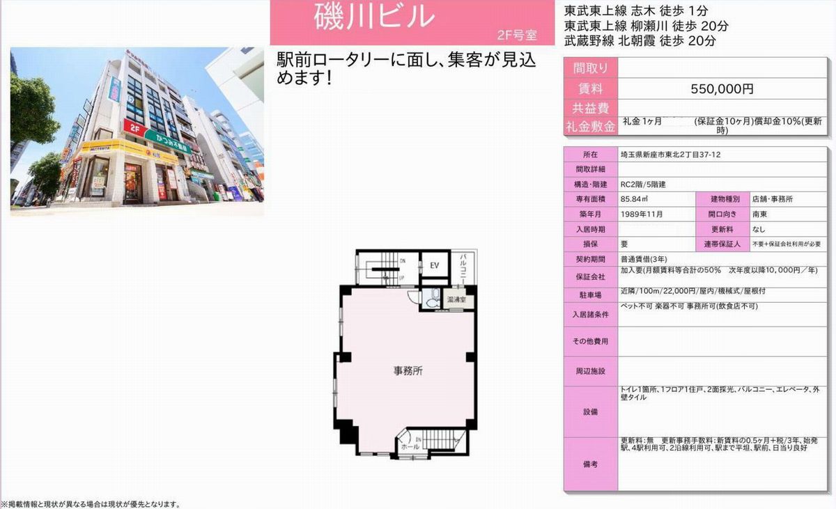 トップページ > 物件検索 > 埼玉県の賃貸事務所・貸店舗 > 新座市東北2-37-12 磯川ビル