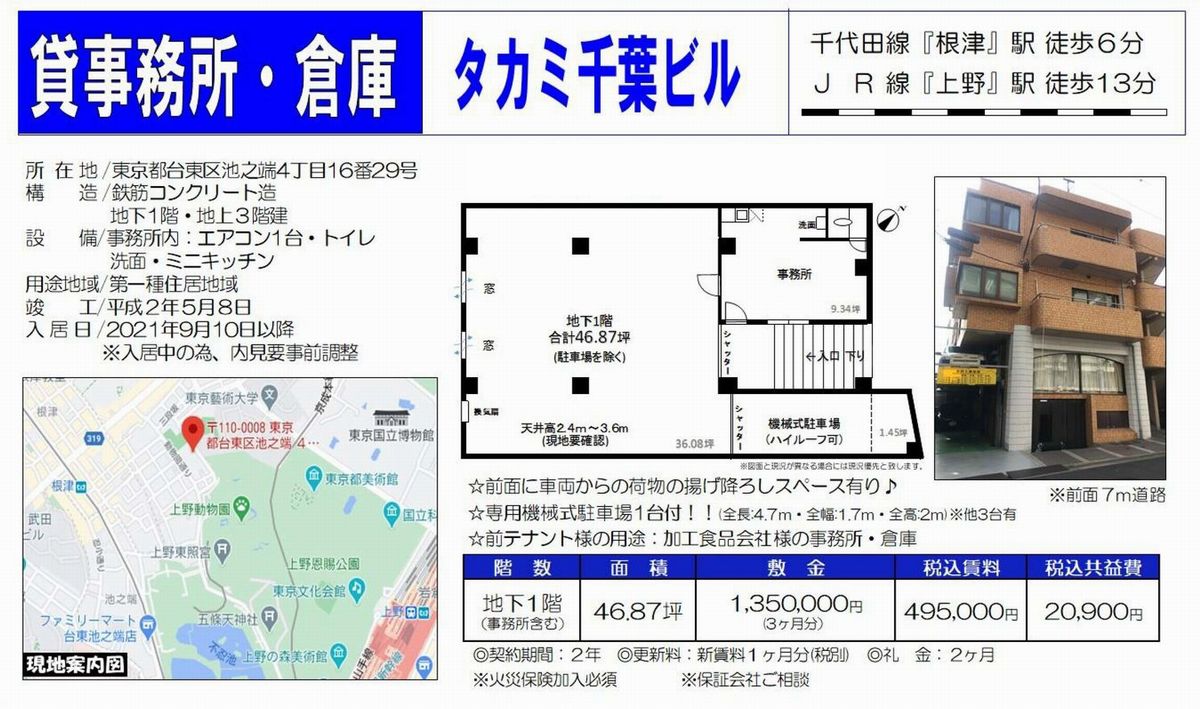 トップページ > 物件検索 > 台東区の賃貸事務所・貸店舗 > 根津の賃貸事務所・貸店舗 > 台東区池之端4-16-29 タカミ千葉ビル B1F部分