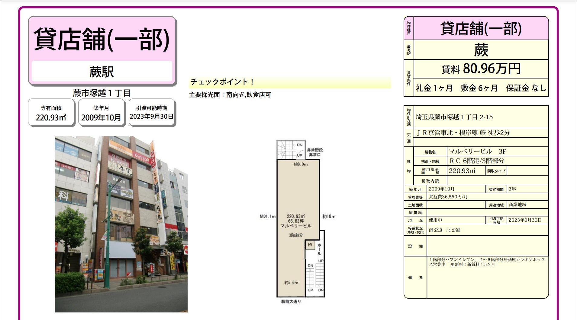 トップページ > 物件検索 > 埼玉県の賃貸事務所・貸店舗 > 蕨の賃貸事務所・貸店舗 > 蕨市塚越1-2-15 マルベリービル部屋番号:3F