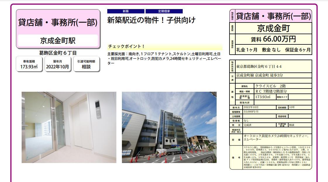 トップページ > 物件検索 > 葛飾区の賃貸事務所・貸店舗 > 葛飾区金町6-4-4 クライスビル部屋番号:2階