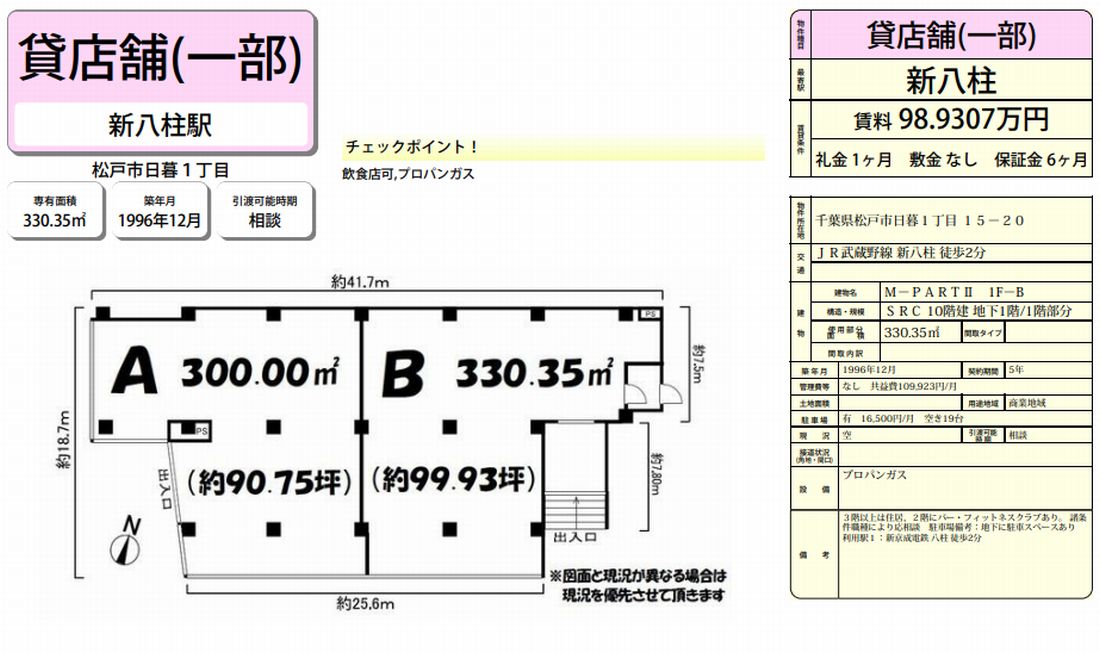 トップページ > 物件検索 > 千葉県の賃貸事務所・貸店舗 > 松戸市日暮1-15-20 M−PART?部屋番号:1F−B