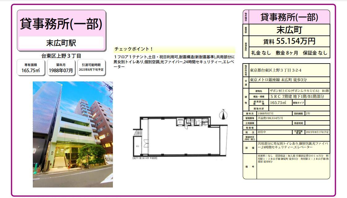 | 備考 | 1フロア1テナント土日・祝日利用可耐震構造(新耐震基準) 条件交渉ご相談ください。 |