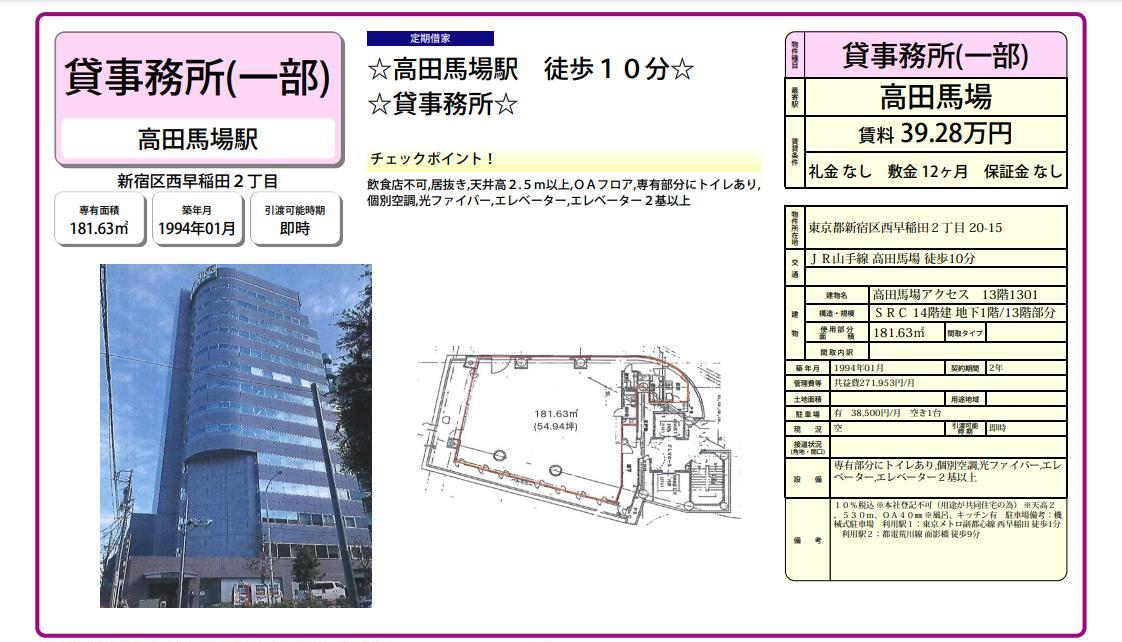 | 物件名 | 高田馬場アクセス部屋番号:13階1301 |