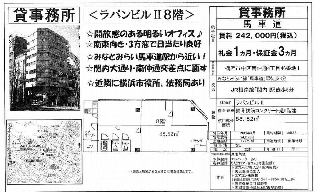 トップページ > 物件検索 > 横浜市の賃貸事務所・貸店舗 > 横浜市中区南仲通4-46-1 ラパンビル? 8階