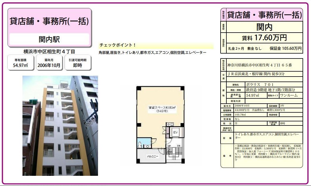 トップページ > 物件検索 > 横浜市の賃貸事務所・貸店舗 > 関内の賃貸事務所・貸店舗 > 横浜市中区相生町4-65番 ポラリス部屋番号:701