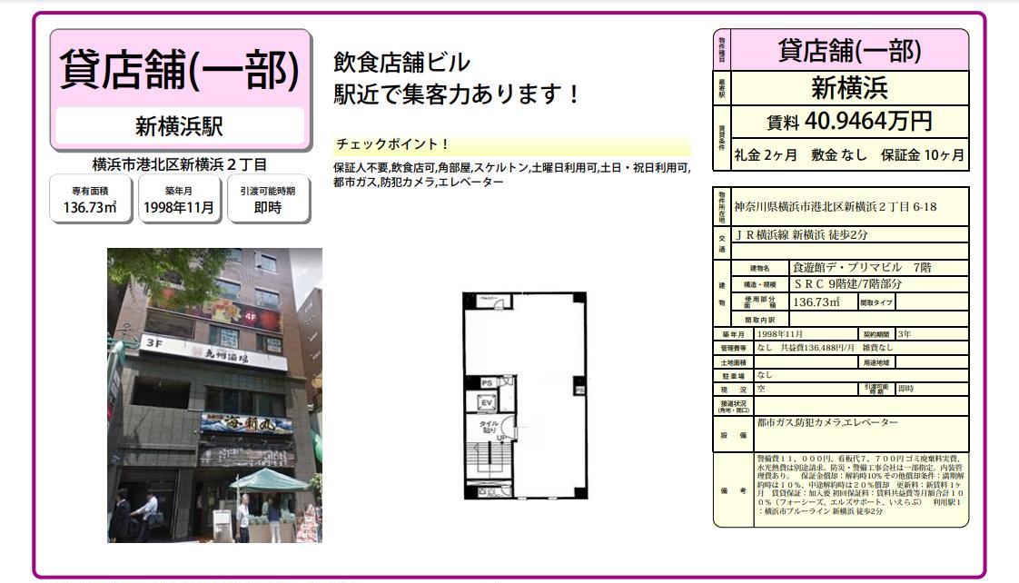 トップページ > 物件検索 > 横浜市の賃貸事務所・貸店舗 > 新横浜の賃貸事務所・貸店舗 > 横浜市港北区新横浜2-6-18 食遊館デ・プリマビル