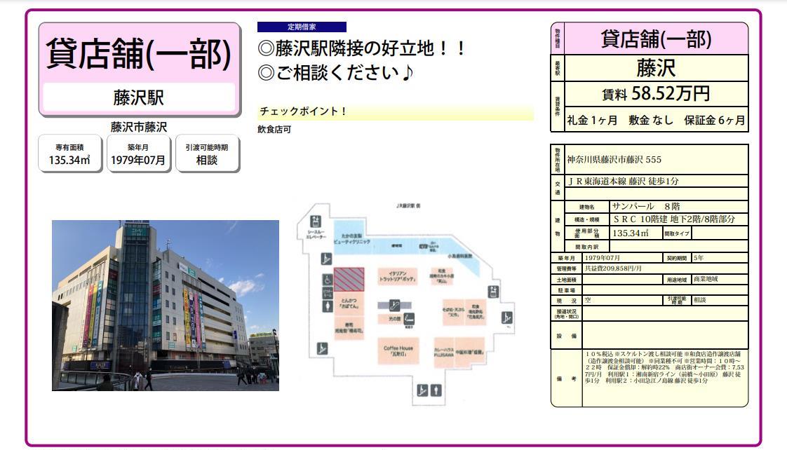 トップページ > 物件検索 > 神奈川県の賃貸事務所・貸店舗 > 藤沢の賃貸事務所・貸店舗 > 藤沢市藤沢555 サンパール