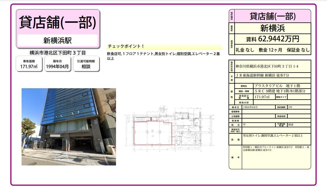 トップページ > 物件検索 > 横浜市の賃貸事務所・貸店舗 > 新横浜の賃貸事務所・貸店舗 > 横浜市港北区下田町3-1-4 プラスタリアビル