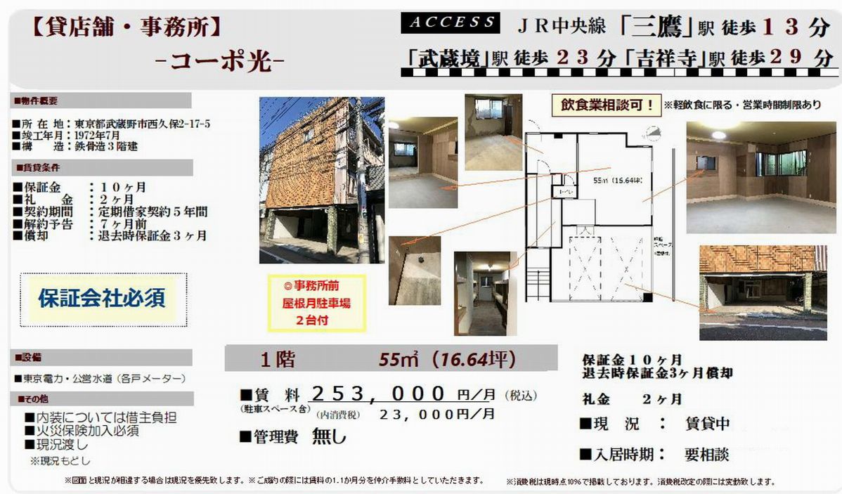 トップページ > 物件検索 > 東京都の賃貸事務所・貸店舗 > 武蔵野市西久保2-17-5 コーポ光