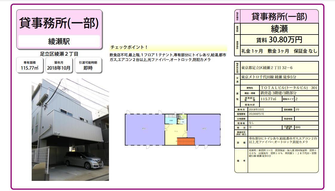トップページ > 物件検索 > 足立区の賃貸事務所・貸店舗 > 綾瀬の賃貸事務所・貸店舗 > 足立区綾瀬2-32-6 TOTALビル(トータルビル)