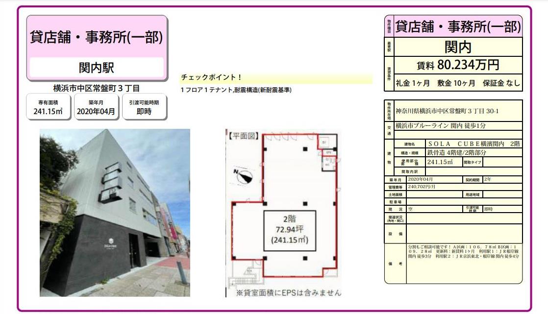 トップページ > 物件検索 > 横浜市の賃貸事務所・貸店舗 > 関内の賃貸事務所・貸店舗 > 横浜市中区常盤町3-30-1 SOLACUBE横濱関内