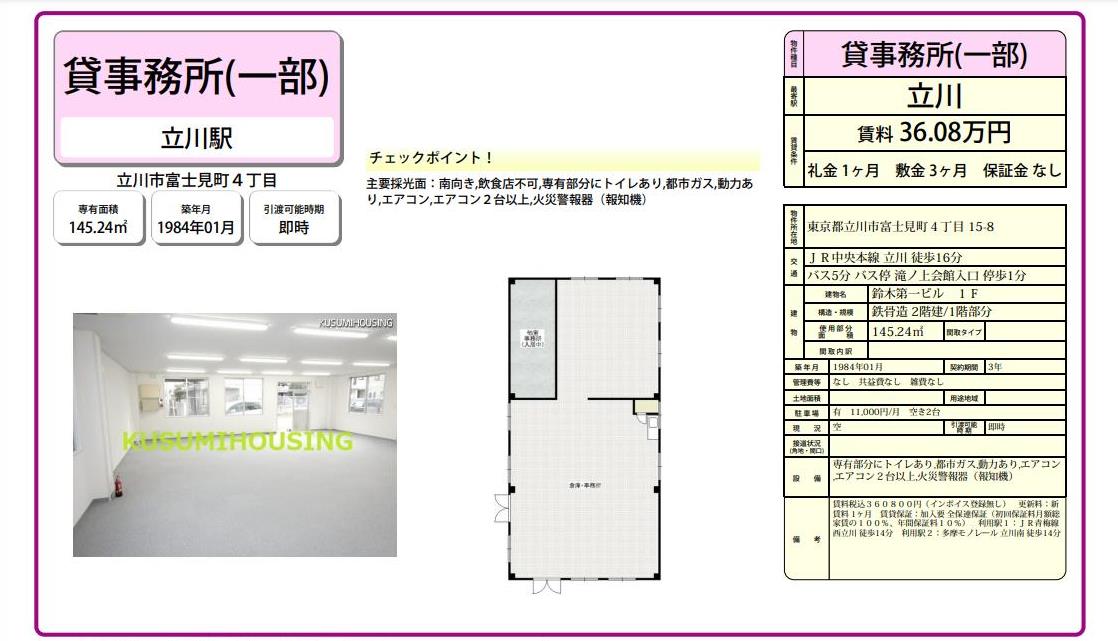 トップページ > 物件検索 > 東京都の賃貸事務所・貸店舗 > 立川の賃貸事務所・貸店舗 > 立川市富士見町4-15-8 鈴木第一ビル