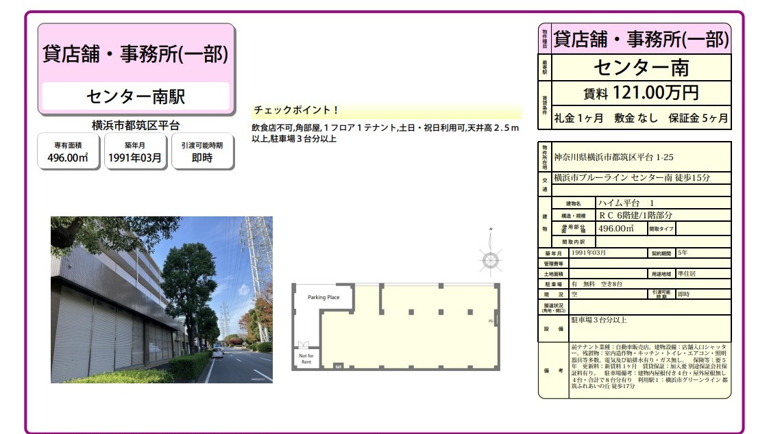 トップページ > 物件検索 > 横浜市の賃貸事務所・貸店舗 > センター南の賃貸事務所・貸店舗 > 横浜市都筑区平台1-25 ハイム平台